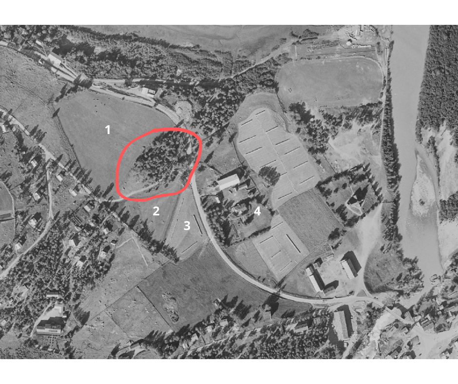 Flyfoto av Lom frå 1958. Det er områda med tala 1, 2 og 3 som no vert omtala som Kulihaugen. Opprinneleg var det skogholtet mellom desse (innsirkla) som vart kalla Kulihaugen.
