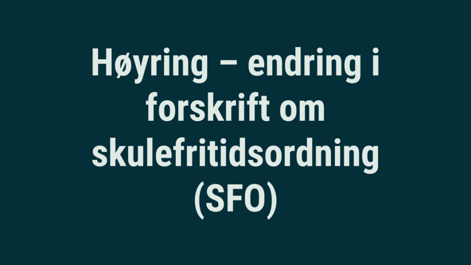 Høyring – endring i forskrift om skulefritidsordning (SFO) Kommunestyret har den 07.04.2026 vedteke å leggje forslag til endringar i forskrift om skulefritidsordning (SFO) ut på høyring. Endringane er knytte t...